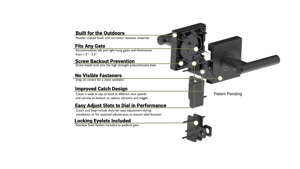 - Sure catch design improve gate catch at different shut speeds while preventing vibration once closed.